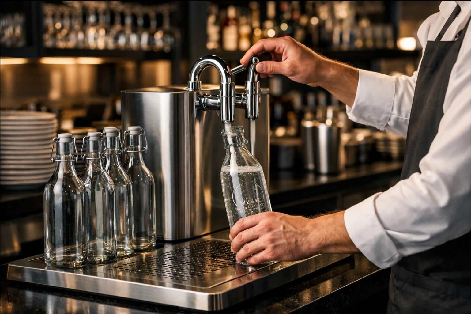 •Sistemas de Filtrado Propios: Muchos locales están optando por instalar máquinas de filtrado de alta calidad. Esto les permite ofrecer un agua con mejor sabor que la del grifo, embotellarla en recipientes reutilizables y cobrar un pequeño importe por el servicio, reduciendo drásticamente el uso de plásticos y los costes de logística de las botellas tradicionales.