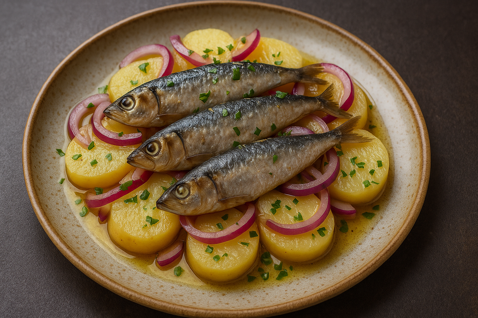- Montaje tibio: en bandeja, coloca la patata tibia, reparte la cebolla con parte de la vinagreta y corona con las xoubas. Termina con ralladura de limón, perejil y un hilo de AOVE. Sirve al momento.